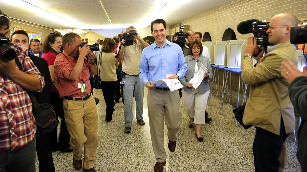 Wisconsin Gov. Scott Walker, after voting Tuesday in Wauwatosa, Wis., in the state's gubernatorial recall. Tom Lynn/Getty Images hide caption