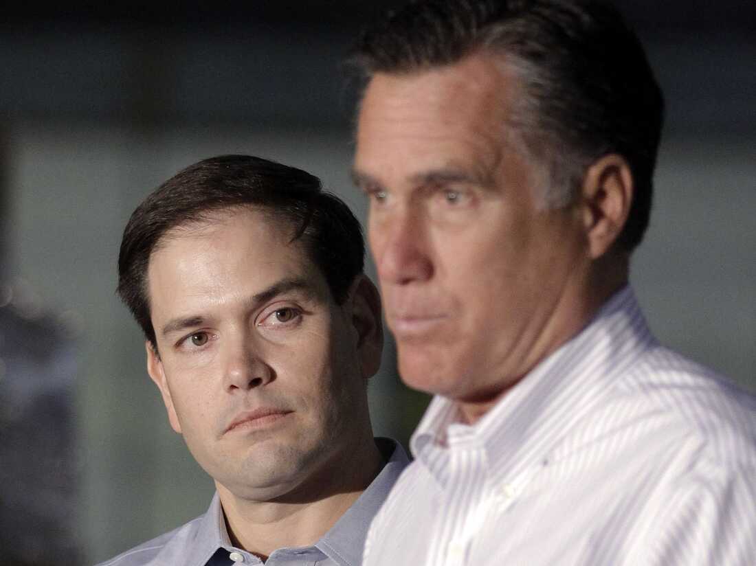 Sen. Marco Rubio, R-Fla., listens at left as Republican presidential candidate Mitt Romney speaks in Aston, Pa., in April. Republican leaders from Jeb Bush to John McCain have touted Rubio for vice president.