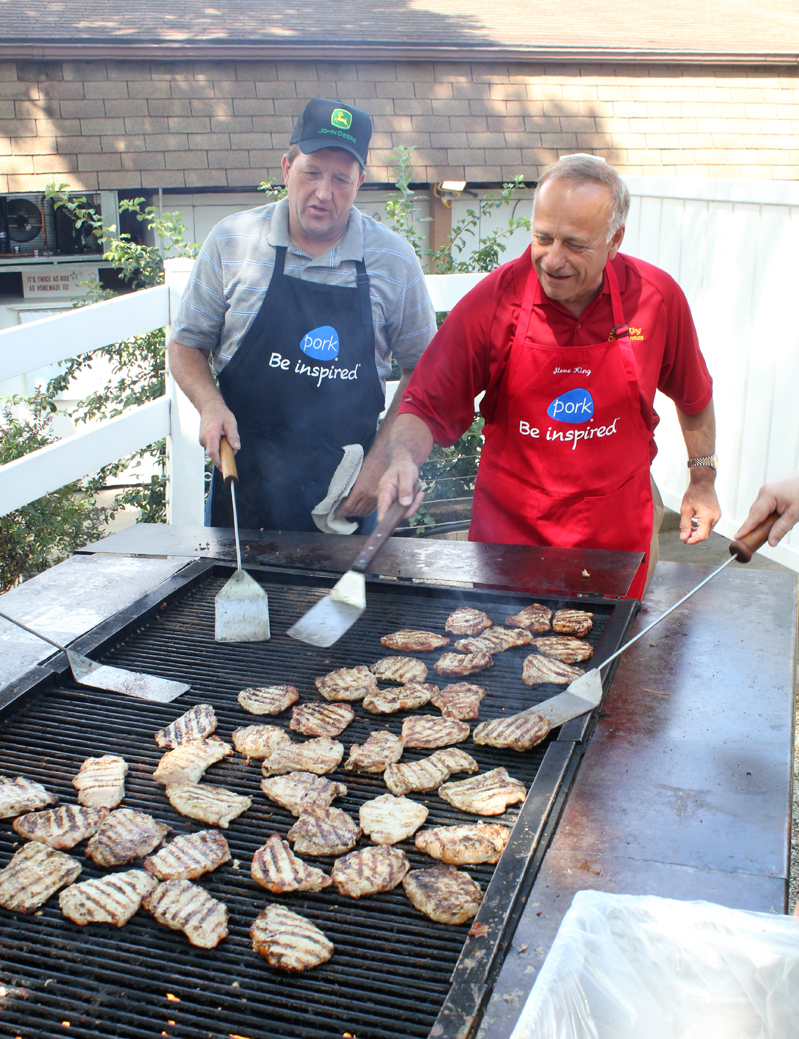Republican Rep. Steve King of Iowa (right) flips pork chops at the Iowa State Fair in Des Moines while Terry Aupperle of Wiota watches. Aupperle lives in Cass County. He can't vote for King anymore because of redistricting.