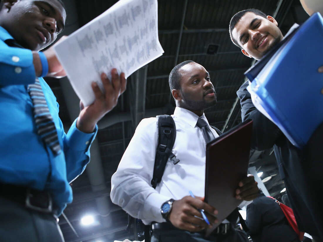 Young job-seekers look over a list of 85 business participating in a job fair last week in Washington, D.C. Chip Somodevilla/Getty Images hide caption