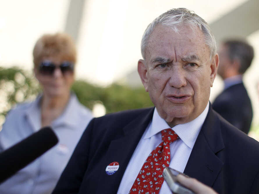 Wisconsin Senate candidate Tommy Thompson, a Republican, talks to the media after voting in the primary election on Aug. 14 in Madison. Andy Manis/AP hide caption