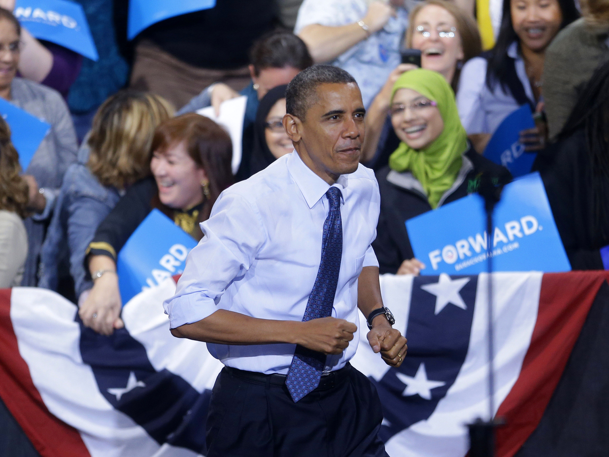 President Obama takes the stage Friday during a campaign event at George Mason University in Fairfax, Va. Pablo Martinez Monsivais/AP hide caption