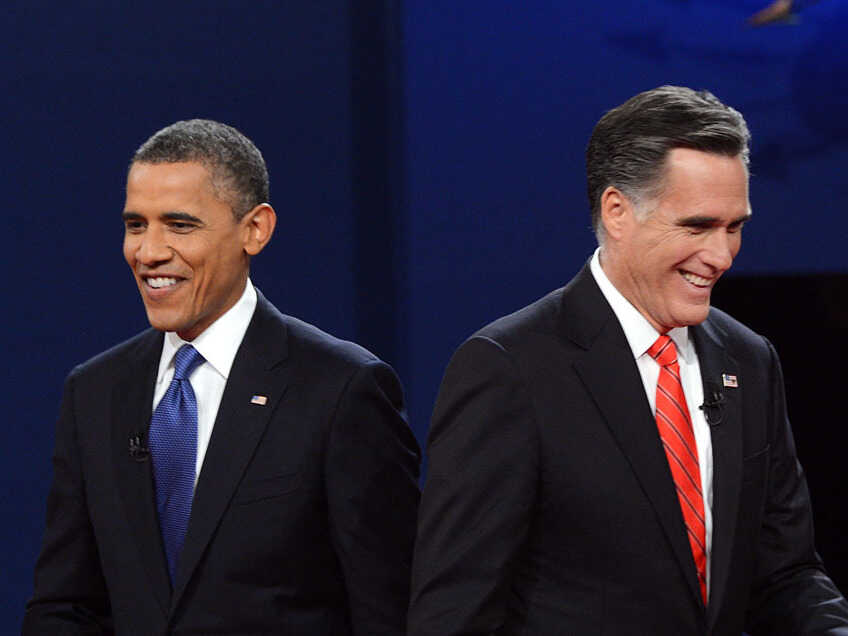 President Obama and Republican presidential candidate Mitt Romney finish their debate at the University of Denver on Oct. 3. Saul Loeb/AFP/Getty Images hide caption