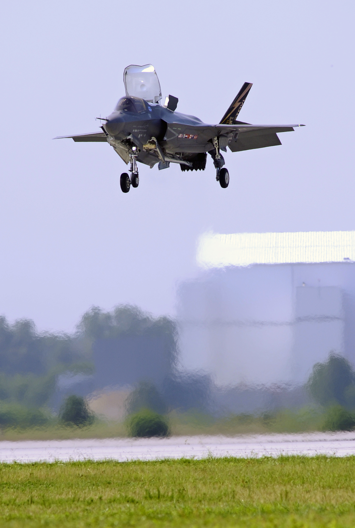 A Marine Corp F-35B Joint Strike Fighter lands at Patuxent Naval Air Station in Maryland in 2011. Analysts say that if mandatory Pentagon budget cuts are imposed next year, fewer new planes could ultimately be ordered.