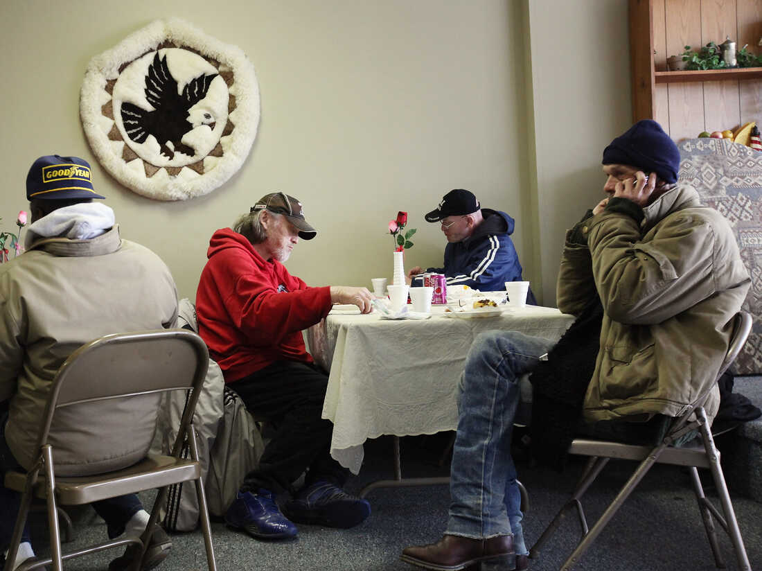 People eat a free community meal at The Center in Lima, Ohio, earlier this year. Although more than 46 million Americans are poor, the issue has gotten little attention in the presidential race. Mario Tama/Getty Images hide caption