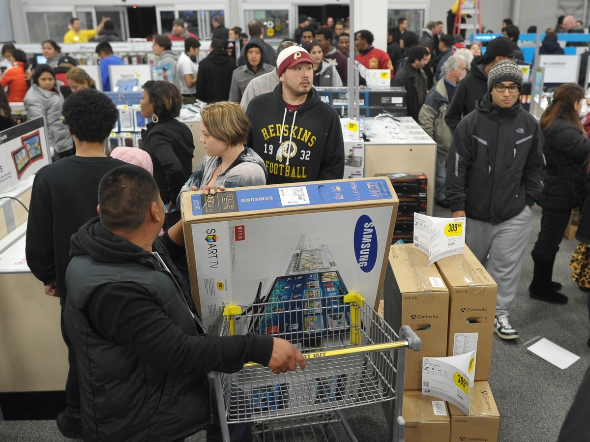 Shoppers line up in a Best Buy store in Rockville, Md., during a Black Friday sale. Thanksgiving weekend sales jumped nearly 13 percent from last year, the National Retail Federation says.