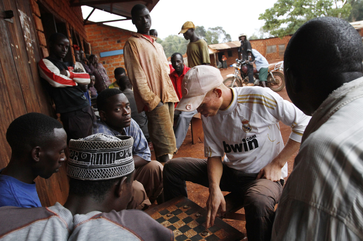 Maajabu Boaz, 20, who has albinism, plays checkers with local men where he feels safe in Nengo Village, Kibondo, Tanzania. Boaz has a reputation of carrying knives for self-protection.