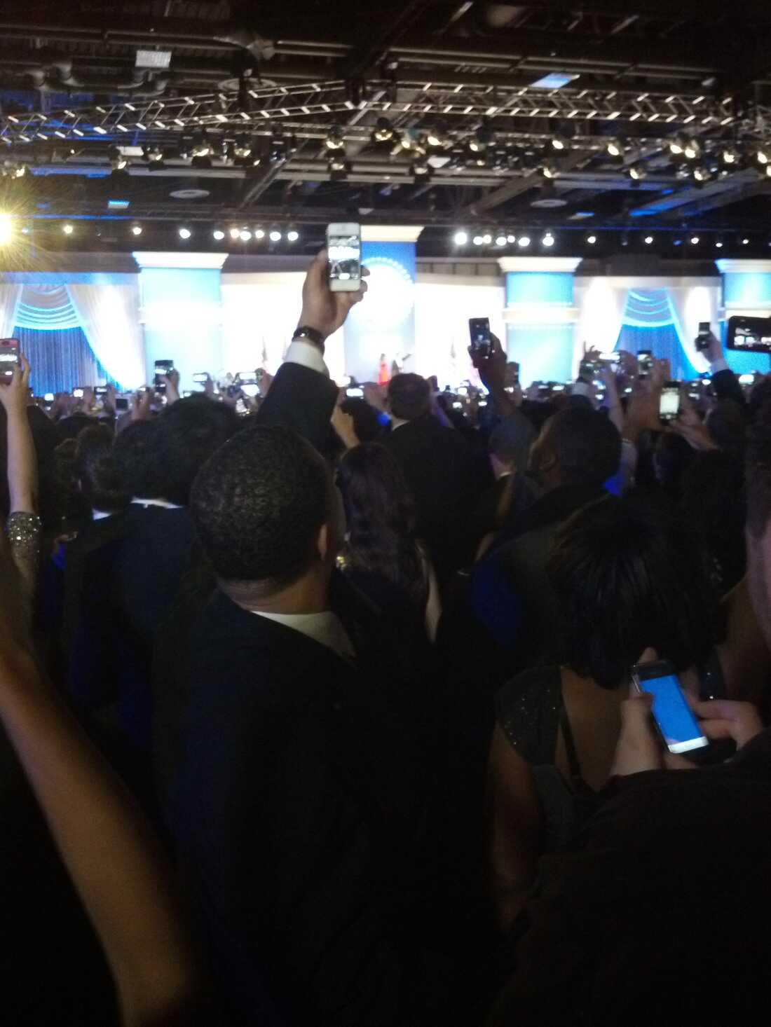 The crowd at an inaugural ball Monday night strains to get photos — many, many photos — of the Obamas as they step out on stage. Linda Holmes/NPR hide caption