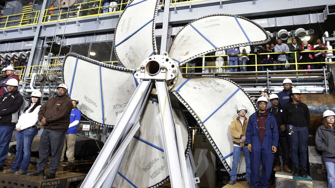 Shipyard workers wait for President Obama to speak about looming automatic federal budget cuts Tuesday in Newport News, Va. Charles Dharapak/AP hide caption