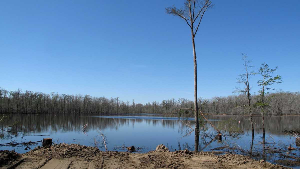 Debbie Elliott/NPR"This is the sinkhole," says Texas Brine spokesman Sonny Cranch. He looks out over what appears to be a lake surrounded by swampland and a fresh earthen levee. It was all swamp before Aug. 3, the morning workers discovered the sinkhole.