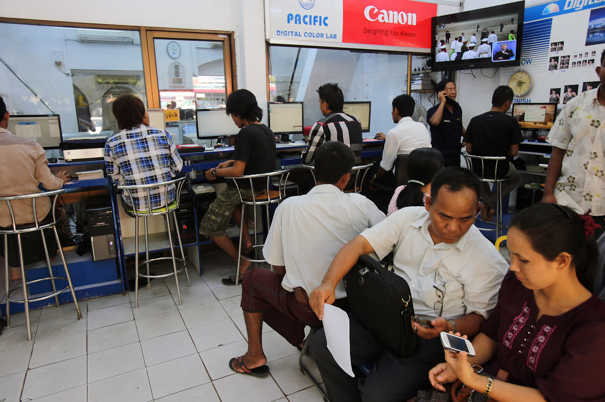 Customers at an Internet and multimedia services store in Yangon, Myanmar. The country is working to expand and improve Internet and mobile phone networks nationwide.