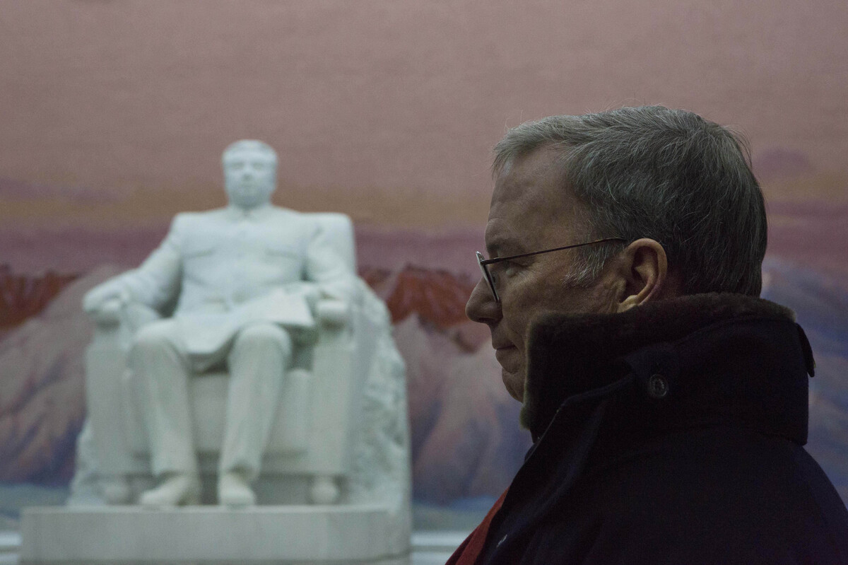 Eric Schmidt, Google's executive chairman and former CEO, stands near a statue of the late North Korean leader Kim Il Sung in Pyongyang in January. He's headed now to Myanmar, another largely untapped market.