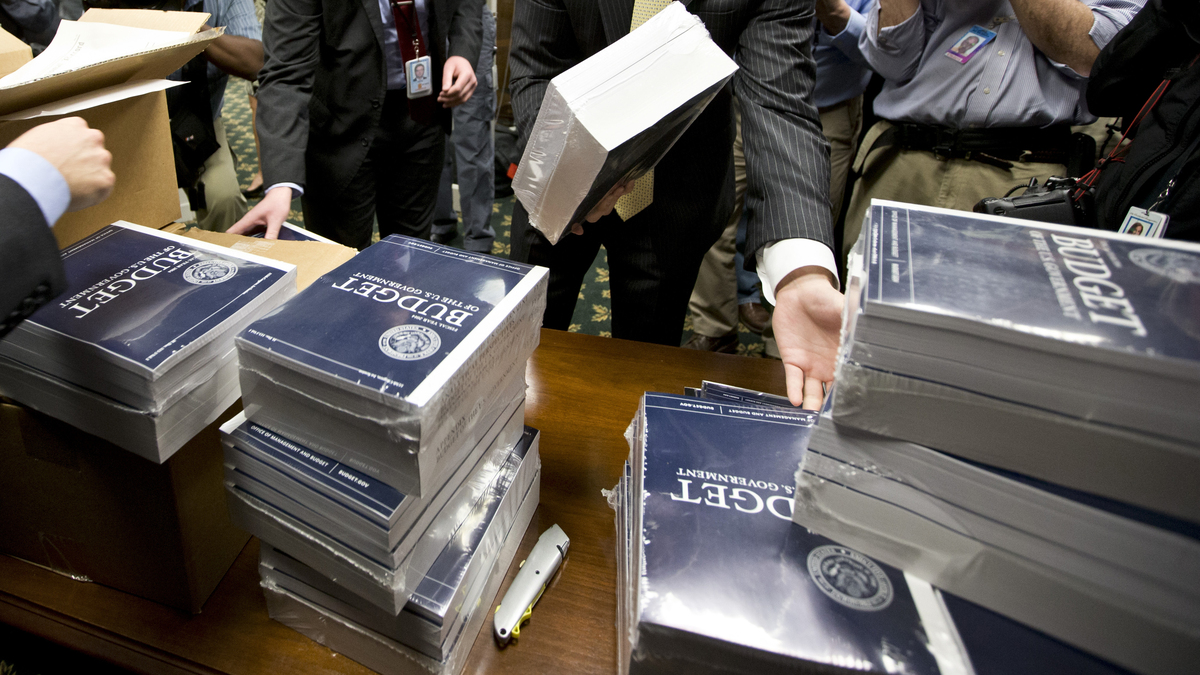 Copies of President Obama's budget plan for fiscal year 2014 are distributed to Senate staff on Capitol Hill on Wednesday.