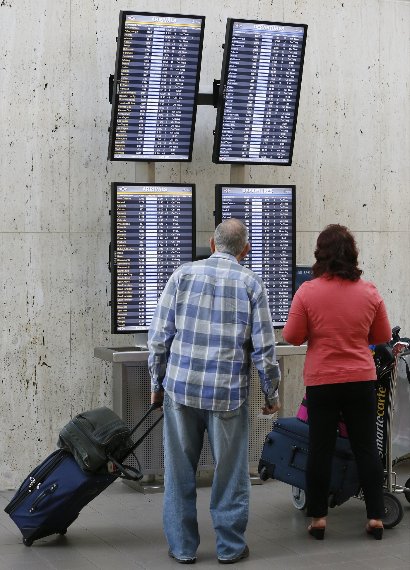 Passengers check their flight status at Los Angeles International airport on Monday. The FAA said staffing cuts were causing delays in the Eastern U.S.