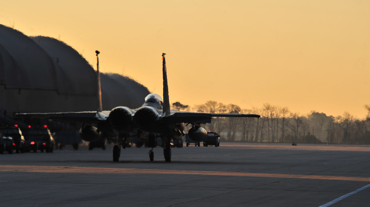 At Seymour Johnson Air Force Base in North Carolina, training flights are part of the daily routine. F-15 fighter jets roll down the flight line and launch into a cloudy sky.