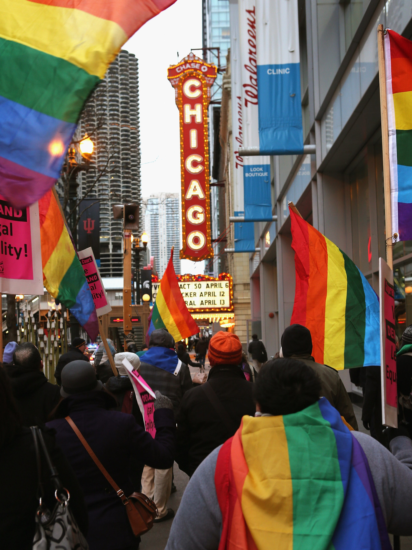 Activists rally in support of gay marriage on March 25 in Chicago. The Illinois Senate has approved legislation that will legalize same-sex marriage, but it has stalled in the state House.