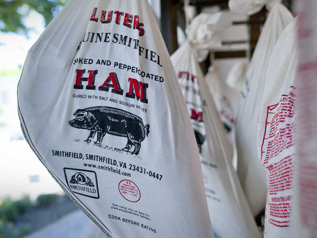 Smithfield hams hang outside the Taste of Smithfield restaurant and gourmet market in Smithfield, Va. Shuanghui International Holdings plans to buy Smithfield Foods, the world's biggest hog producer. Rich-Joseph Facun/Reuters/Landov hide caption
