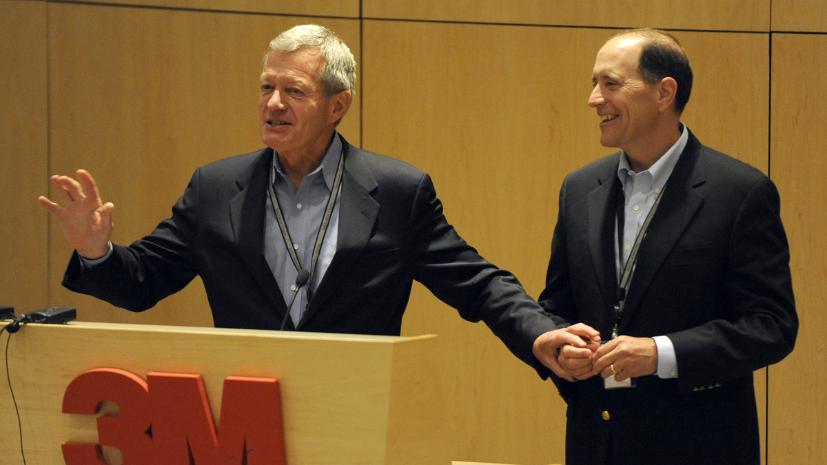 Sen. Max Baucus, D-Mont. left, and Rep. Dave Camp, R-Mich., speak about overhauling tax policy to an audience at the 3M tech company on Monday. Hannah Foslien/AP hide caption
