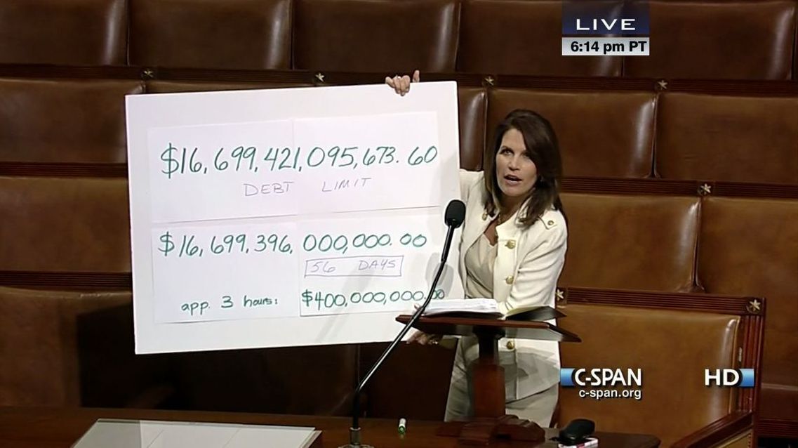 She's been reusing the same chart since February, just swapping out the number of days in red type. Some members have dozens of them, ready to go at a moment's notice. Indiana Republican Rep. Todd Rokita has a whole stack of charts in his office, leftover from a lengthy presentation he gave back in April on the national debt. Back then, he offered a bar chart showing budget deficits through the years, with pictures of presidents on top of each bar. If you had seen it on C-SPAN, occasionally you'd see a hand come into the shot, switching to the next chart. That is Zach Zagar, Rokita's communications director.