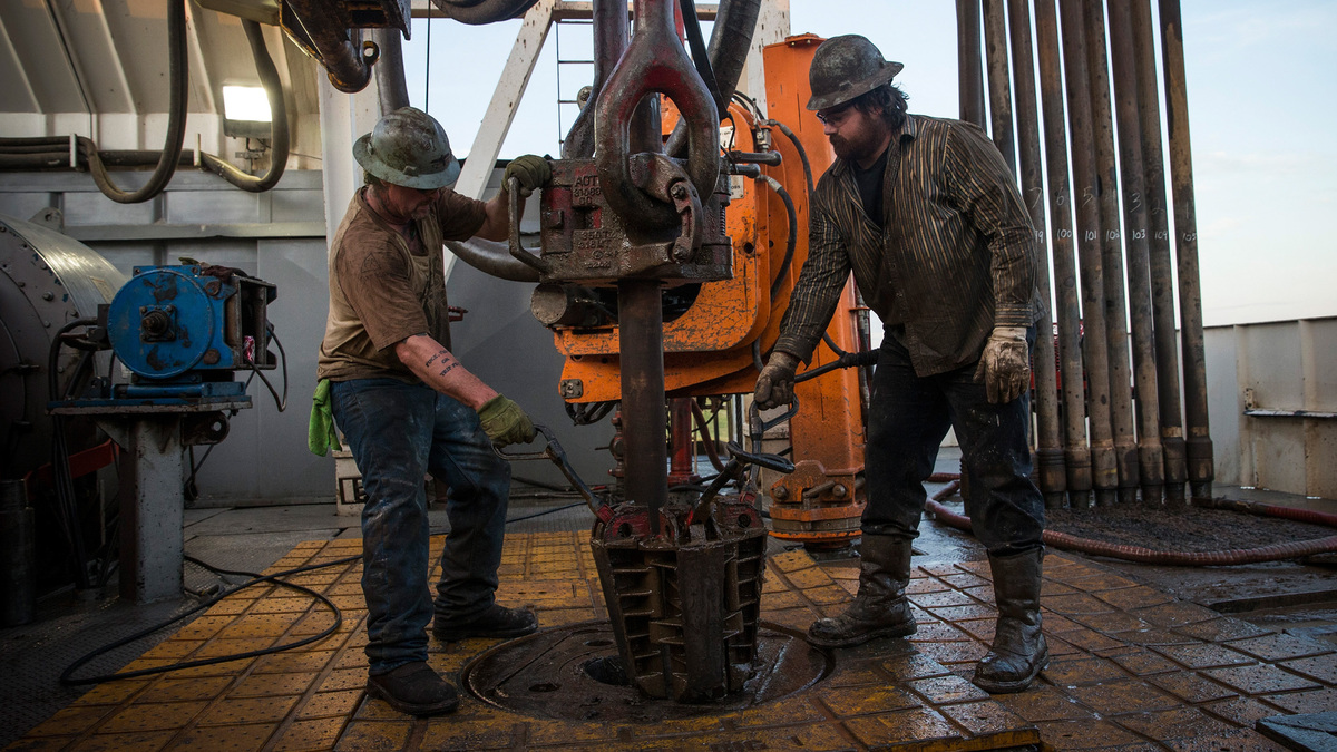 Workers line up pipe while drilling for oil outside Watford City, N.D. While the energy sector has been strong, millions of Americans have been out of work since the recession ended. Andrew Burton/Getty Images hide caption