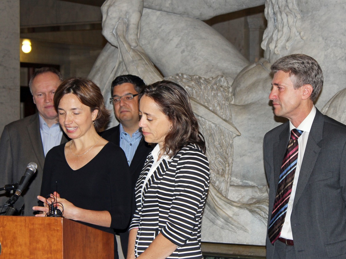 Cathy ten Broeke speaks during a news conference last month at Minneapolis City Hall. She and her partner, Margaret Miles (right), along with Jeff Isaacson (back left) and his partner, Al Giraud (back right), are the first two same-sex couples Mayor R.T. Rybak (right) will marry in the City Hall rotunda on Aug. 1.