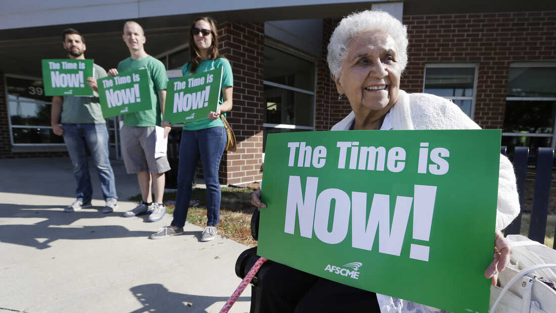 Mary Campos of Des Moines, Iowa, sits outside a forum on immigration held by senators Tom Harkin and Dick Durbin. Charlie Neibergall/AP hide caption
