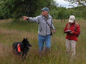 Vesely and Rogue head into the field to demonstrate the dog's ability to search for Western Pond Turtles.