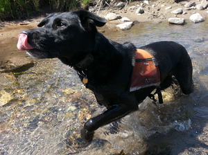 Wicket, seen here, traverses a Wyoming stream in search of moose poop. Megan Parker describes a typical day in the field, from a dog's perspective.