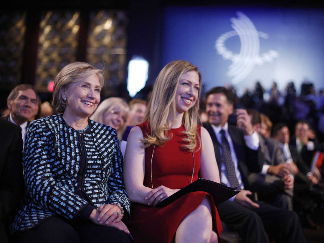 Clinton and her daughter, Chelsea, listen to President Obama and former President Bill Clinton speak at the Clinton Global Initiative on Tuesday.