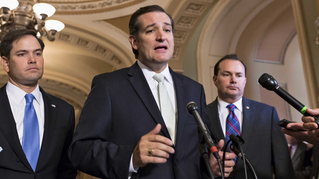 Sen. Ted Cruz, R-Texas, center, Sen. Marco Rubio, R-Fla., left, and Sen. Mike Lee, R-Utah, express frustration on Friday after the Senate passed a bill to fund the government, but stripped it of language crafted by House Republicans to defund Obamacare. J. Scott Applewhite/AP hide caption
