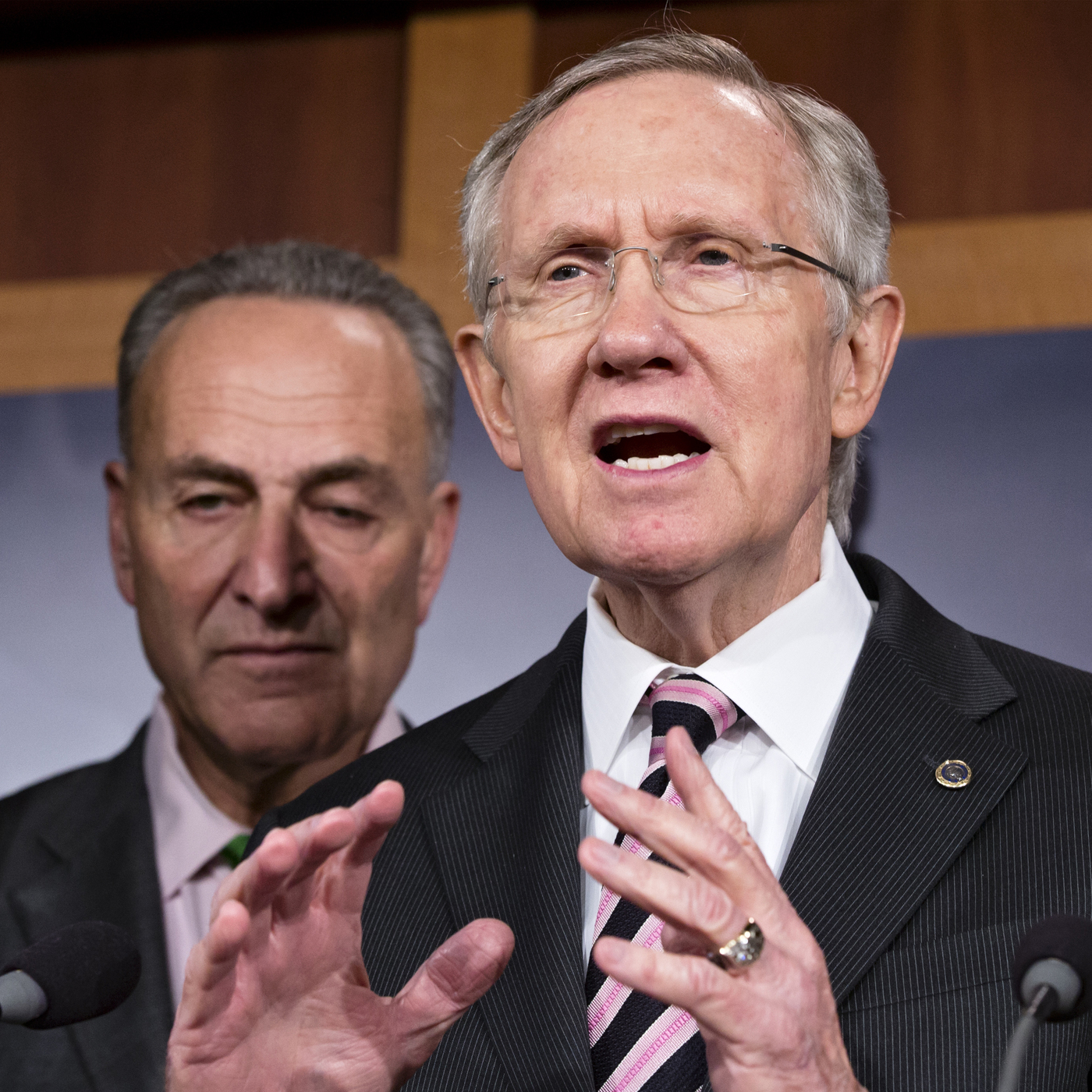 Senate Majority Leader Harry Reid, accompanied by Sen. Charles Schumer, D-N.Y., tells reporters that Republicans need to "get a life and talk about something" other than Obamacare.