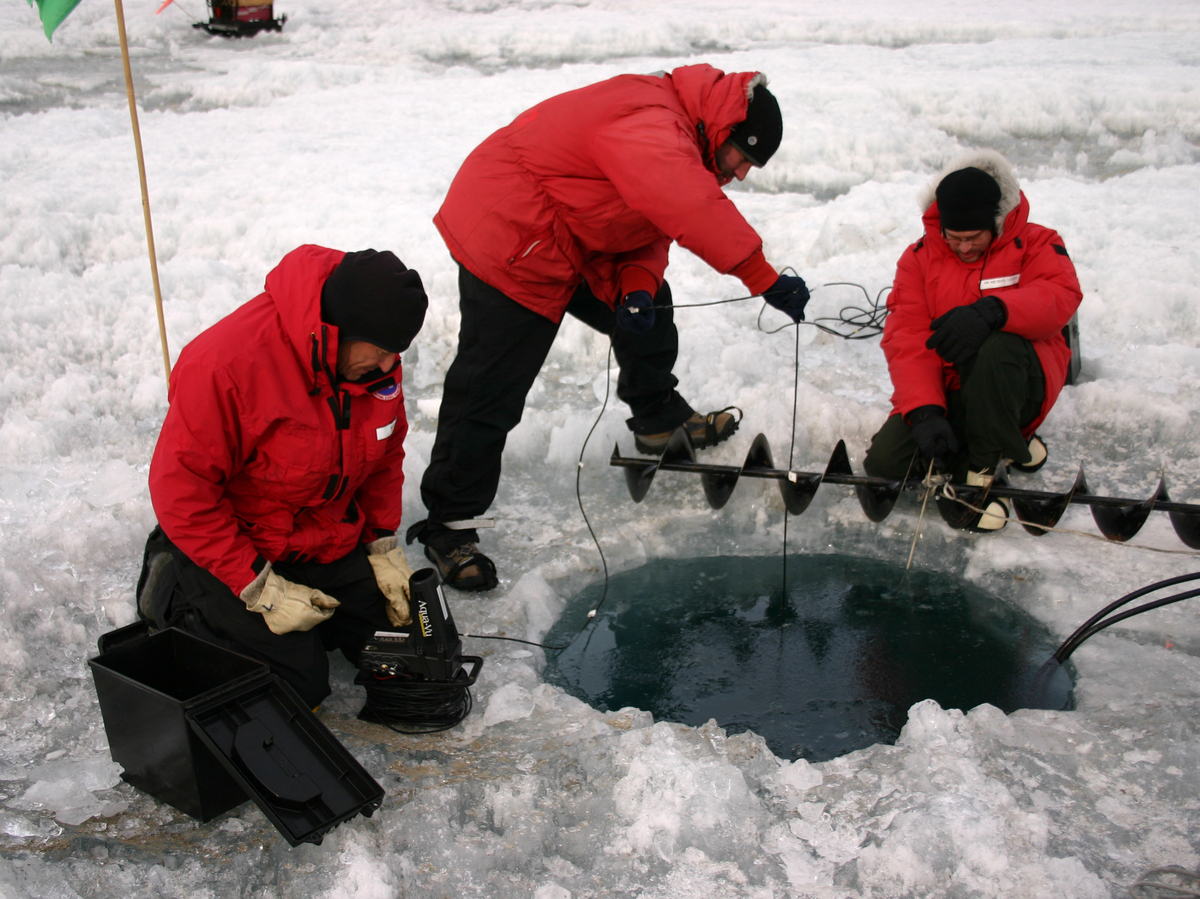 John Priscu, Phil Lee and Mike Lizotte use an underwater camera to check the progress of a hole being melted on Lake Bonney, Antarctica, in 2008.