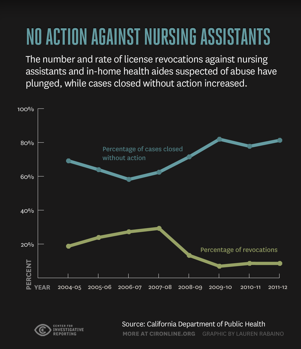 The number and rate of license revocations against nursing assistants and in-home health aides suspected of abuse have plunged, while cases closed without action have increased.