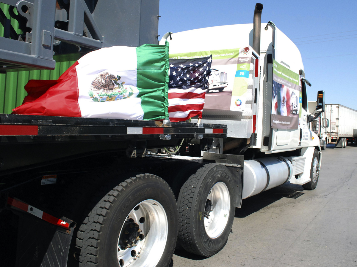 A truck bearing Mexican and U.S. flags approaches the border crossing into the U.S., in Laredo, Texas.