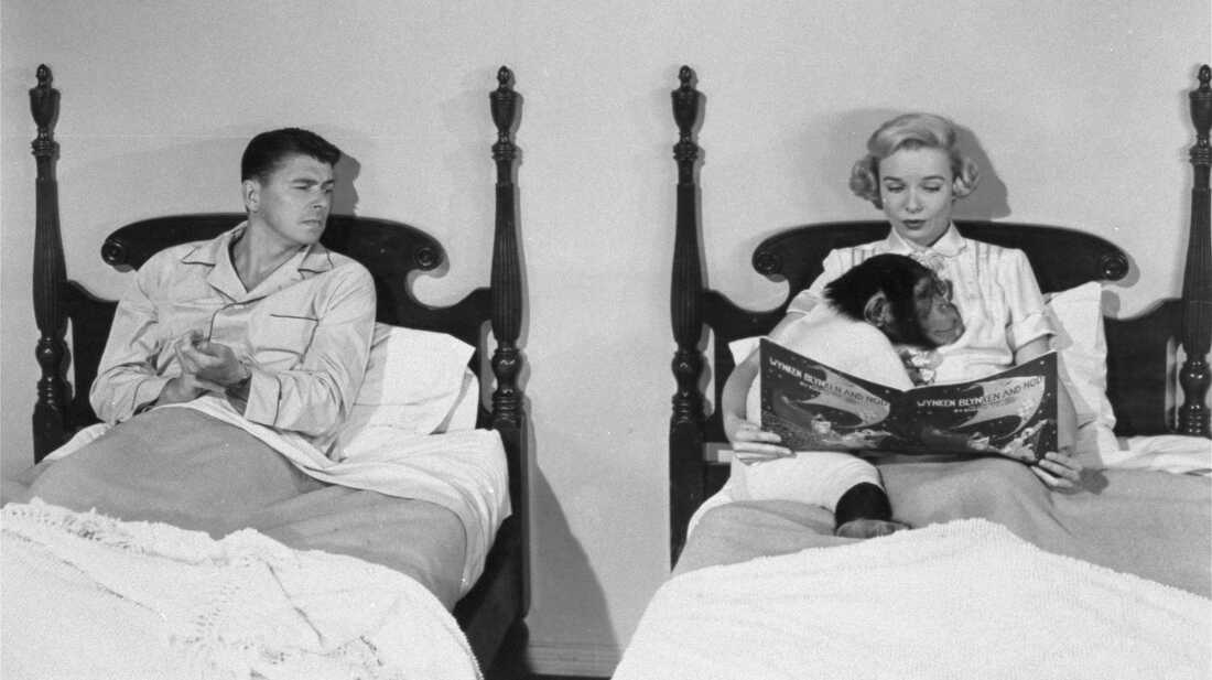 Ronald Reagan, portraying a chimpanzee-raising professor, is shown with Diana Lynn in a scene from the 1951 film Bedtime for Bonzo. AP hide caption