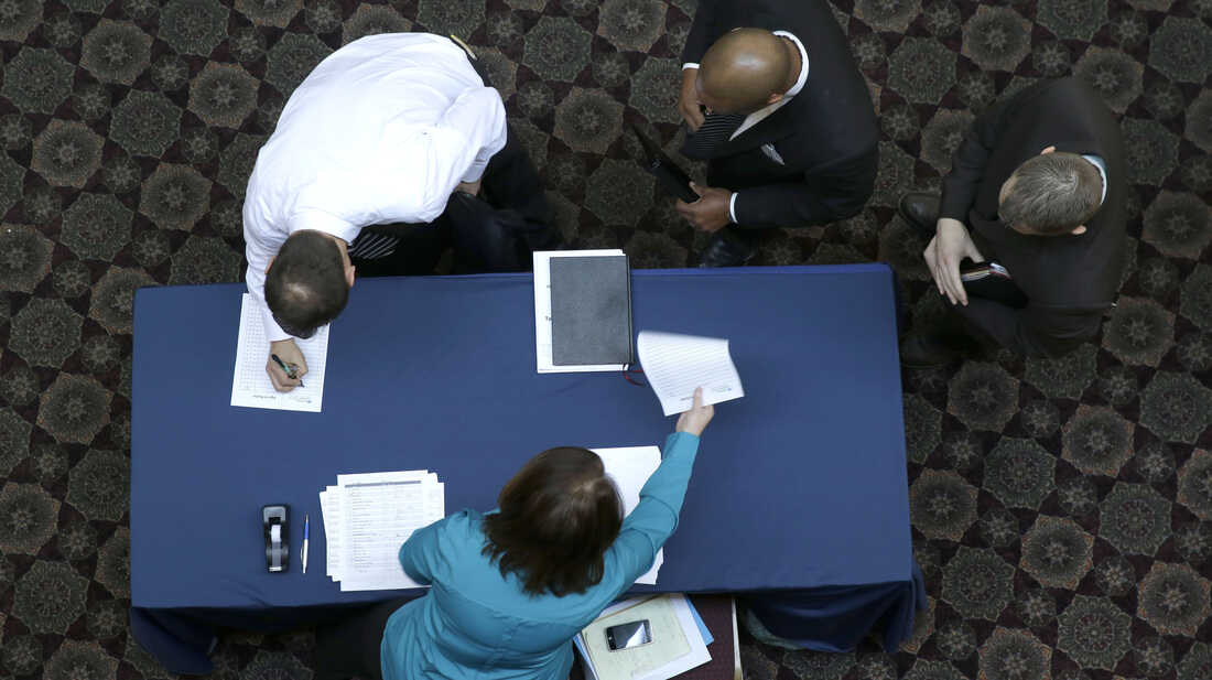 Job seekers sign in before meeting prospective employers during a career fair at a hotel in Dallas last month. LM Otero/AP hide caption