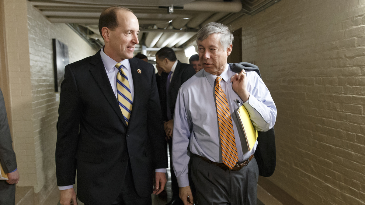 Rep. Dave Camp, R-Mich., left, walks with House Energy and Commerce Committee Rep. Fred Upton, R-Mich. to a Republican caucus meeting on Capitol Hill in Washington. J. Scott Applewhite/AP hide caption