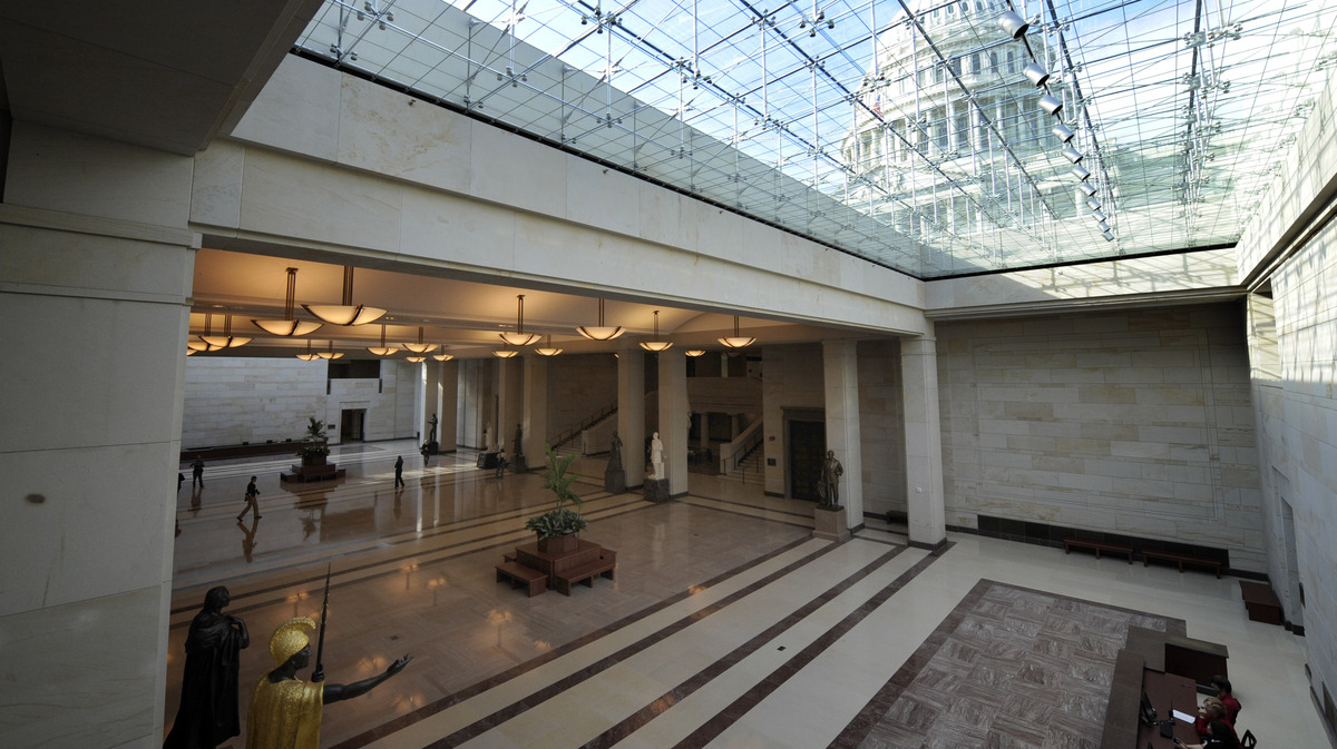 The Capitol Dome is visible through the skylights of the new Capitol Visitor Center.