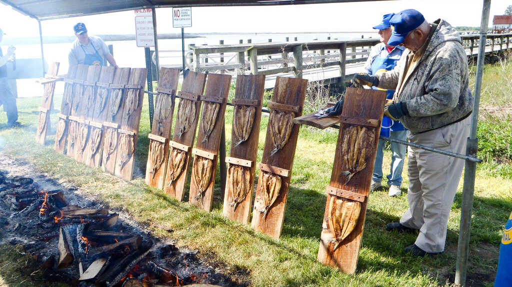 In Wakefield, about an hour southeast of Virginia's capital of Richmond, shad fish have been roasting by on an open fire since 5 a.m. They're nailed to oak planks.
