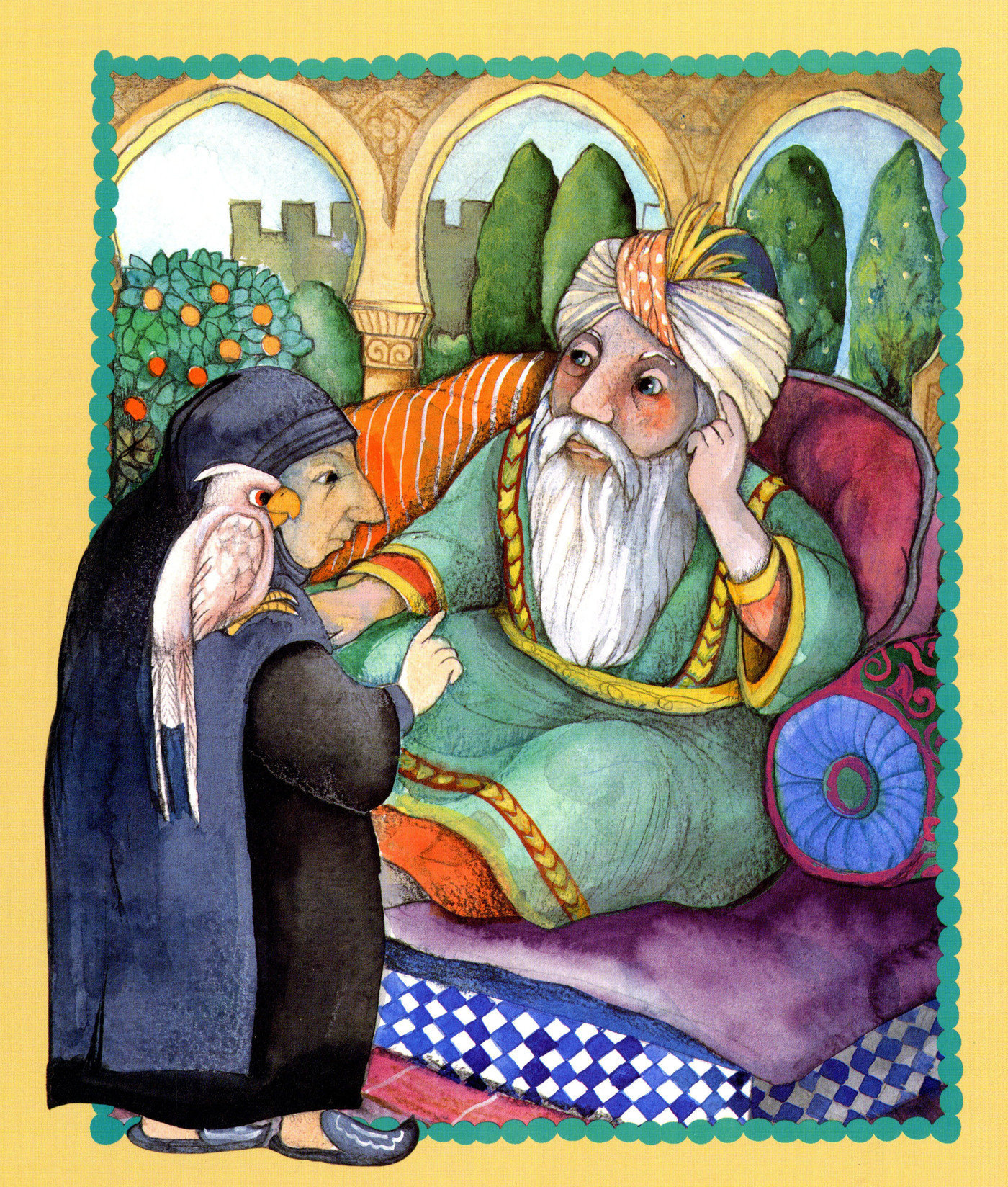 In The Happy Man's Tunic, an old woman (with a white parrot) helps save a caliph's son after he becomes seriously ill. Reprinted with the permission of Atheneum Books for Young Readers, an imprint of Simon & Schuster Children's Publishing Division from "Tales Our Abuelitas Told" by F. Isabel Campoy and Alma Flor Ada. Illustration copyright 2006 by Viví Escrivá. hide caption
