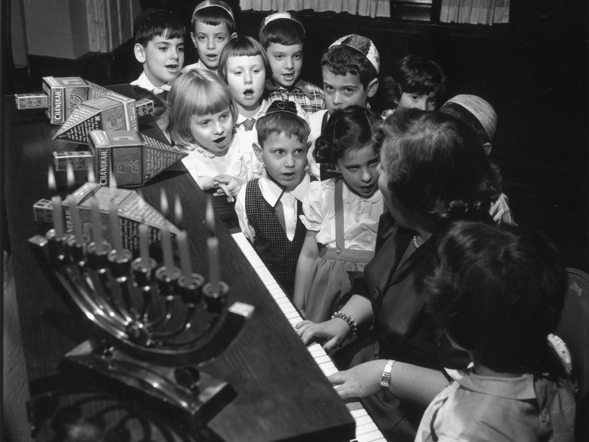Young Jewish children gather around the piano, circa 1955, to perform songs during the Hanukkah celebrations. George Pickow/Getty Images hide caption