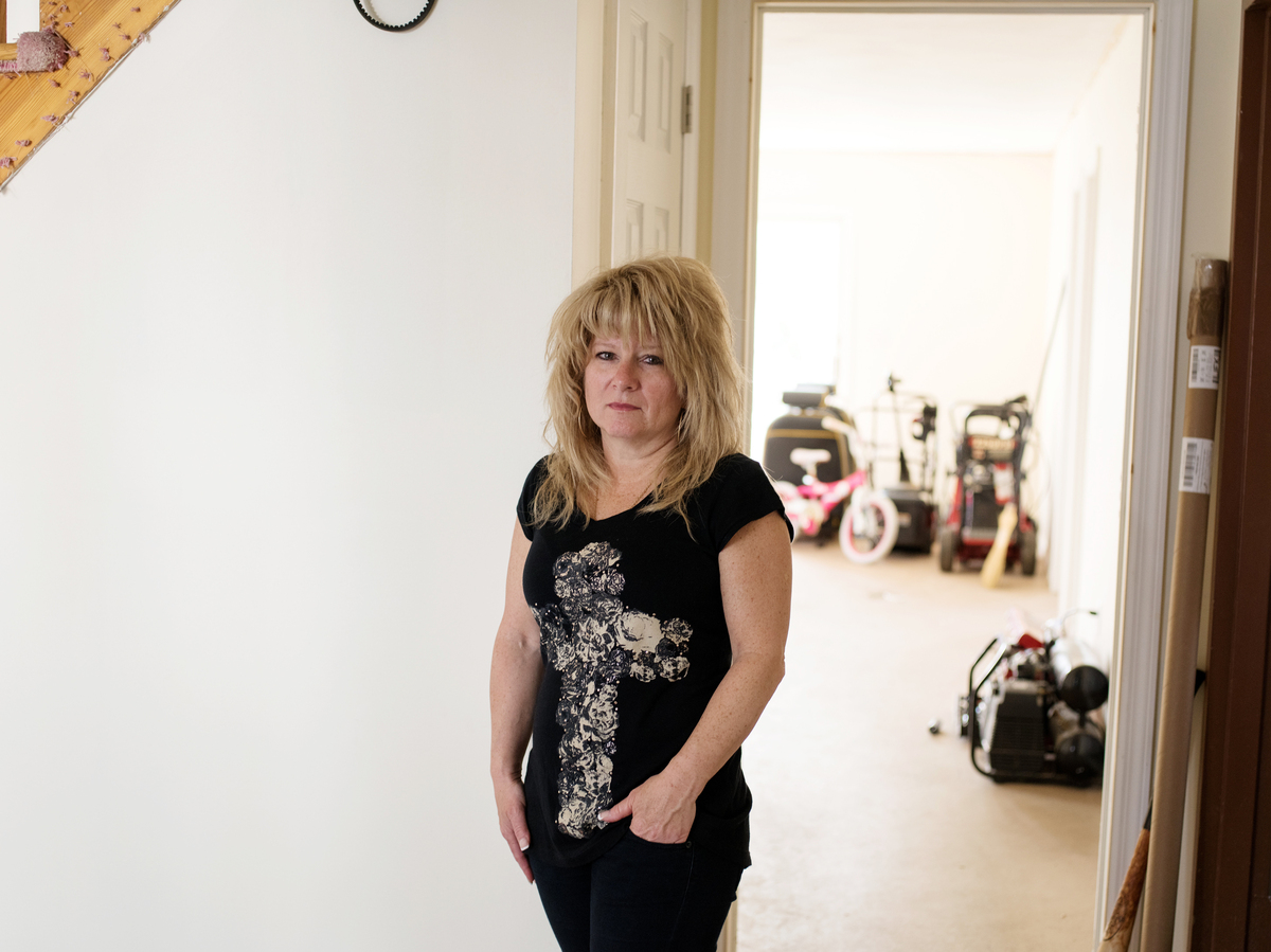 Diane Camerada stands inside her home on Staten Island, N.Y. She has been frustrated with the long bureaucratic process with the Build It Back program.