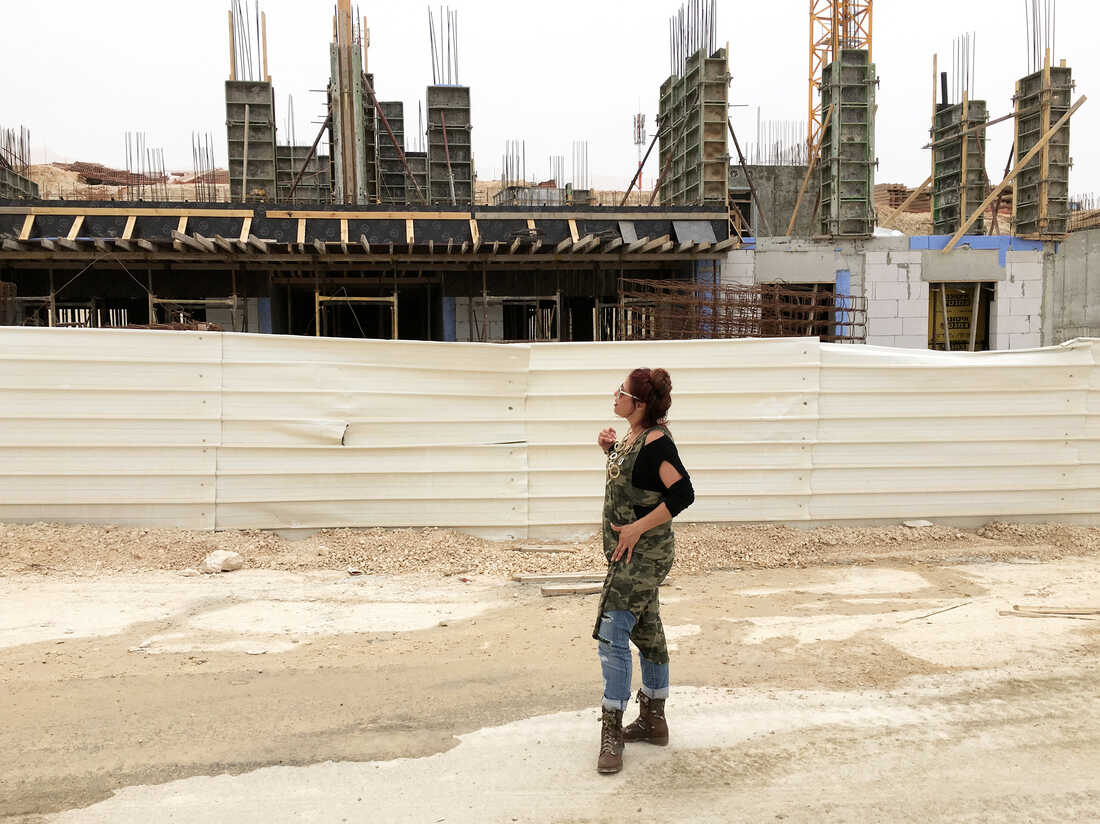 Ronit Shy stands in front of the construction site for the building that will be her future home. She was among 200 Israelis who won a housing lottery with 6,000 entrants. Emily Harris/NPR hide caption