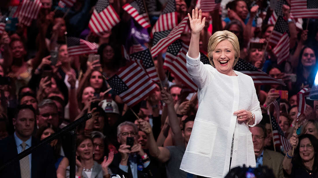 Hillary Clinton arrives onstage during a primary night rally in Brooklyn on June 7. Drew Angerer/Getty Images hide caption