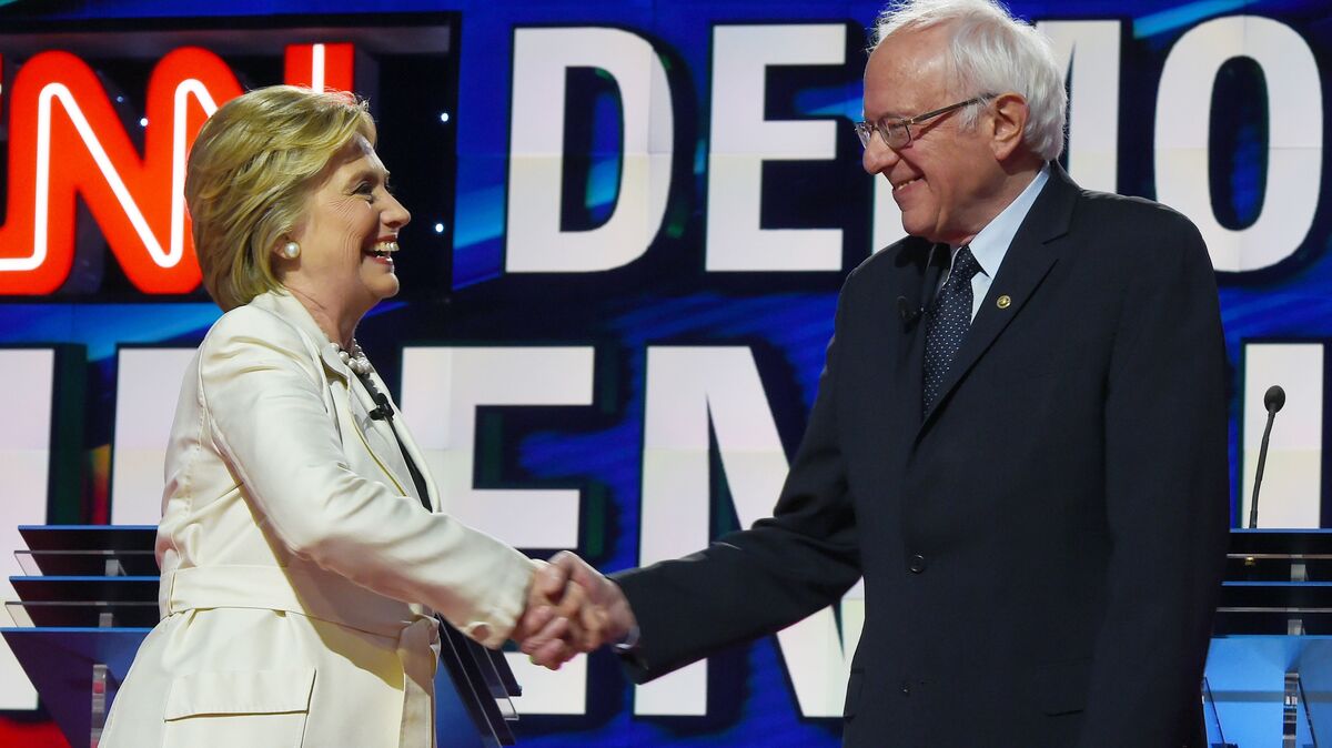 Hillary Clinton and Bernie Sanders shake hands before an April Democratic presidential debate in New York.