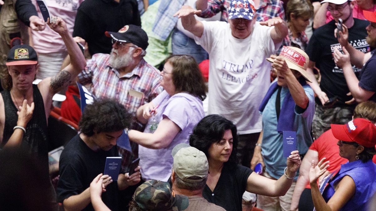 People at a Trump rally hold up copies of the constitution. They are booed, and escorted from the room. This is definitely a new GOP.