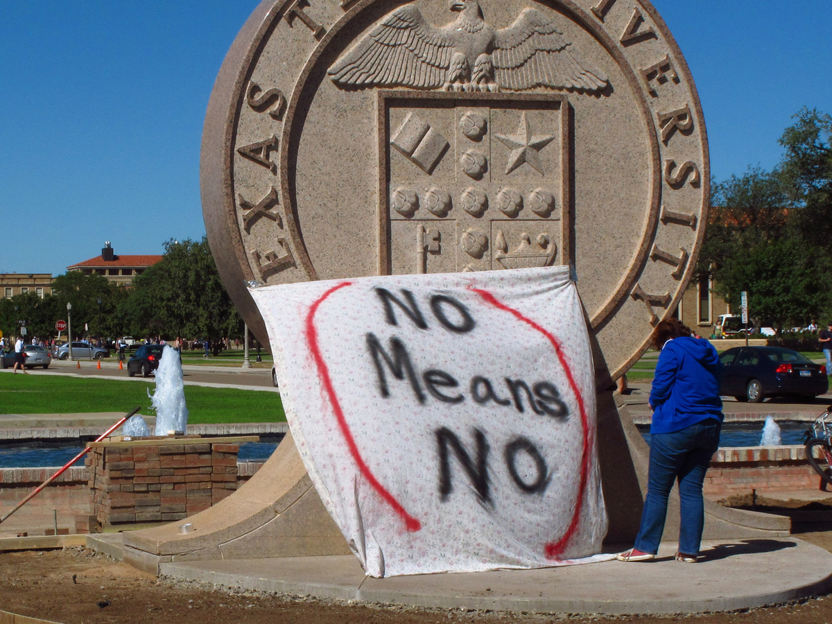 Texas Tech freshman Regan Elder helps drape a bed sheet with the message "No Means No" over the university's seal at the Lubbock, Texas campus in 2014 to protest what students say is a "rape culture" on campus.