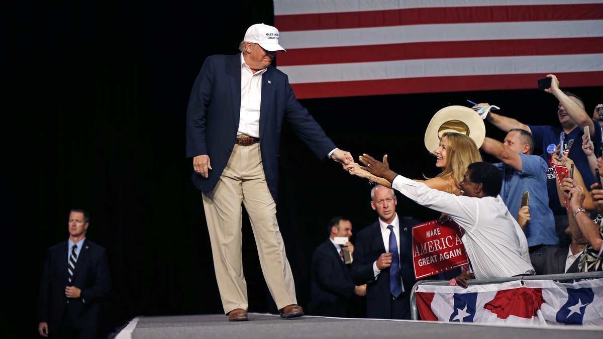 Republican presidential candidate Donald Trump arrives to speak at a rally in Dimondale, Mich., on Friday. Gerald Herbert/AP hide caption