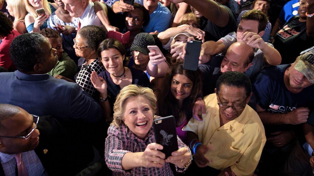 Democratic presidential nominee Hillary Clinton takes a selfie with supporters after speaking at a rally about national service Sept. 30 in Fort Pierce, Fla. Brendan Smialowski/AFP/Getty Images hide caption