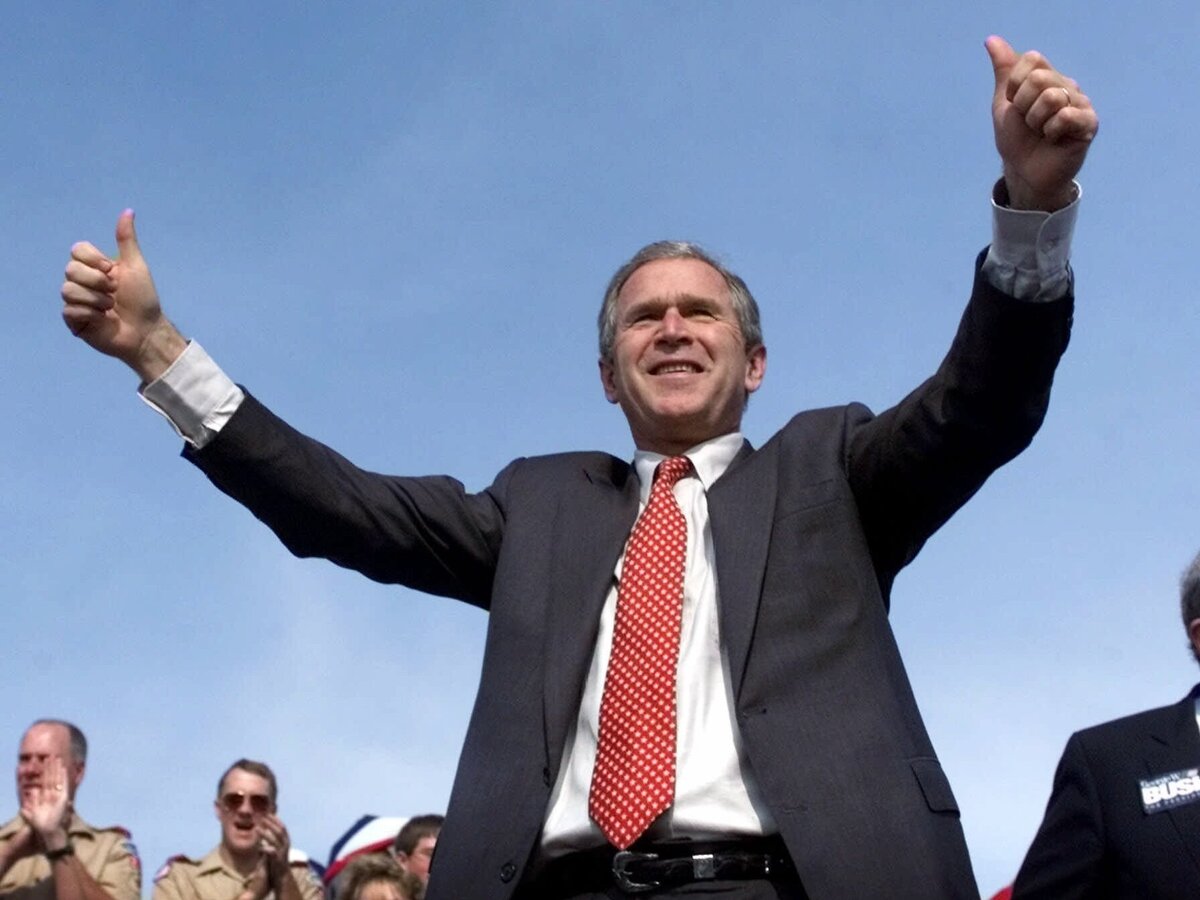 George W. Bush, then as Texas governor, running for president at a rally in Missouri, Oct. 28, 2000. That was days before Bush was put on the defensive when a 24-year-old DUI conviction was revealed.